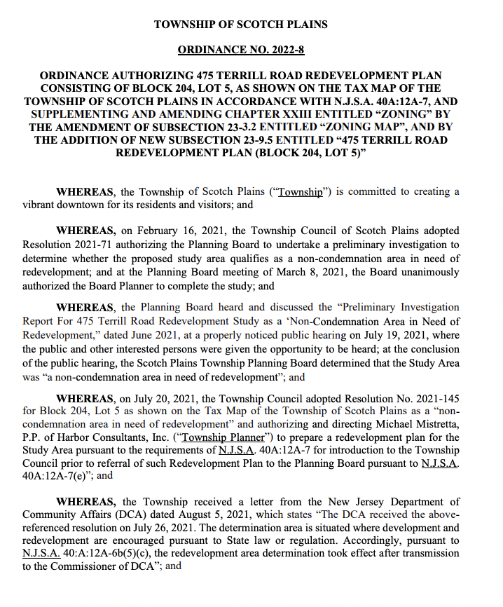 Ordinance No. 2022-8: Ordinance Authorizing 475 Terrill Road Redevelopment Plan