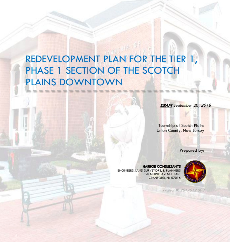 Township Planner Harbor Consultants introduced the Redevelopment Plan for Tier 1, Phase 1 section of the Scotch Plains Downtown, and was endorsed by the Scotch Plains Township Council at their September 25, 2018 Business Meeting. The Council has authorized the issuance of Request for Qualifications / Request for Proposals (RFQ/RFP) for developers to submit plans for development.