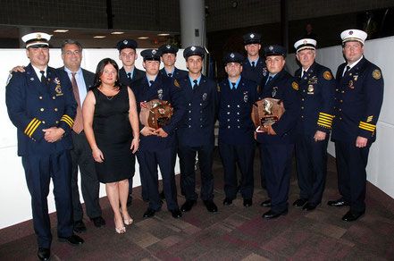Graduates of the June 2015 class of Scotch Plains fire recruits with Chief Lestarchick (far left), Deputy Chief Paal (far right), Officers, and Township officials