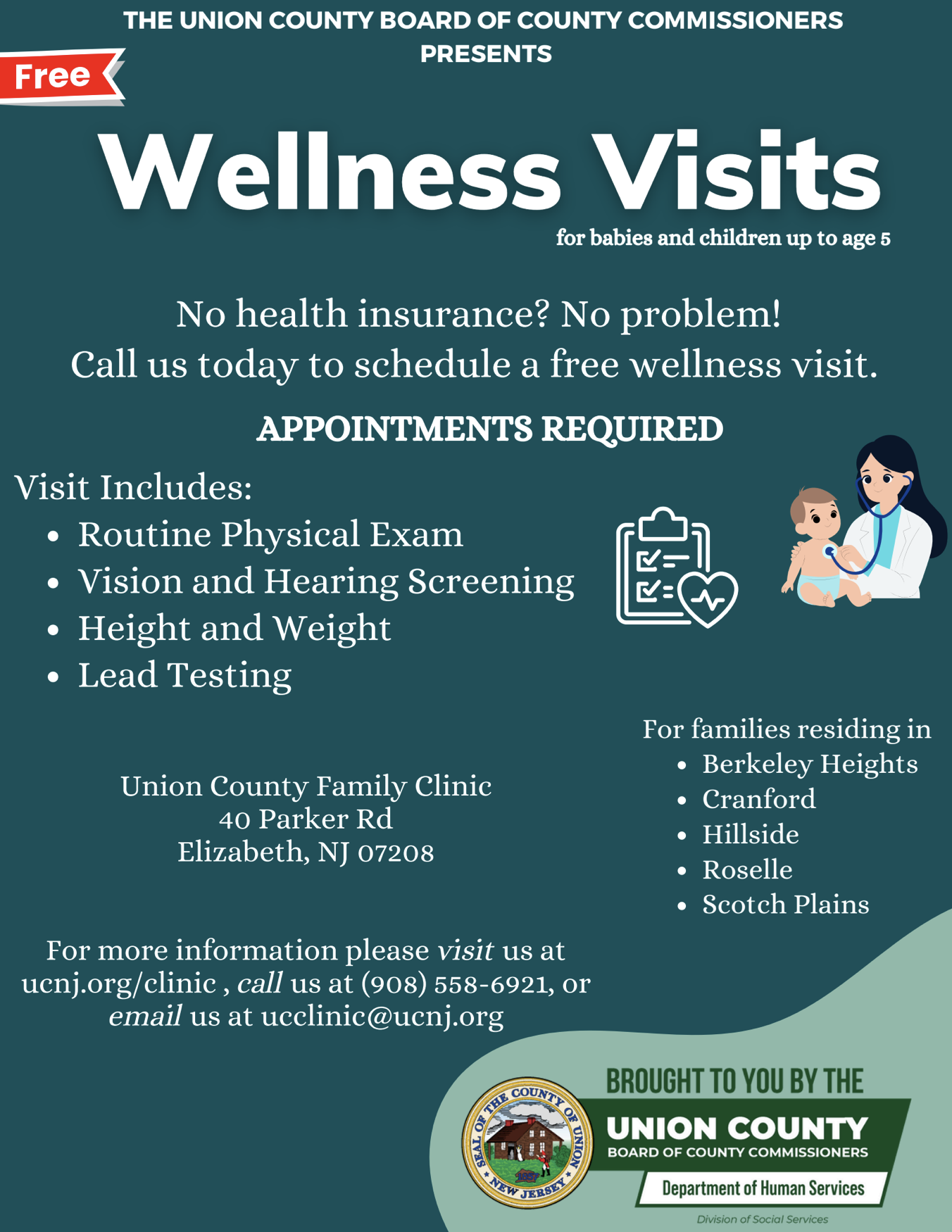 Childhood immunizations and well child visits (appointment required for well child visits) for children under 5 are free to Scotch Plains residents who meet the eligibility requirements.
