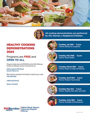 Programs take place IN PERSON at the RWJ Rahway Fitness & Wellness Center’s test kitchen at: