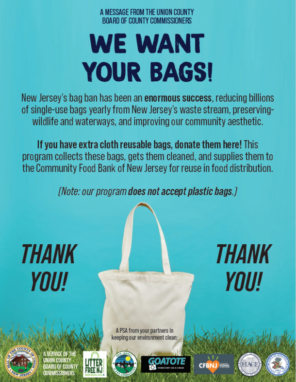 If you have extra cloth reusable bags, donate them here! This program collects these bags, gets them cleaned, and supplies them to the Community Food Bank of New Jersey for reuse in food distribution.