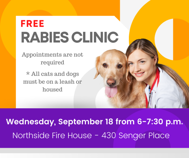 Fall rabies clinic at the Northside firehouse (430 Senger Place) on Wednesday, September 18, 2024 from 6:00 pm – 7:30 pm.