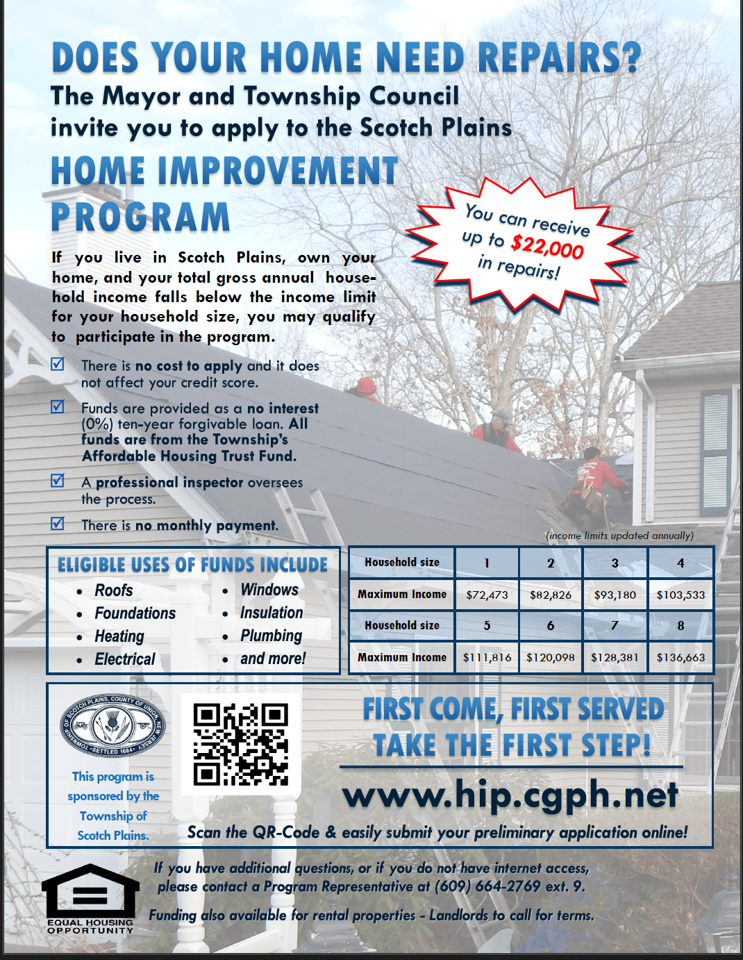 As part of Scotch Plains’ affordable housing obligations – in which the state requires municipalities across New Jersey to expand the housing stock for low- and middle-income households – we are also required to administer a “Home Improvement Program.”