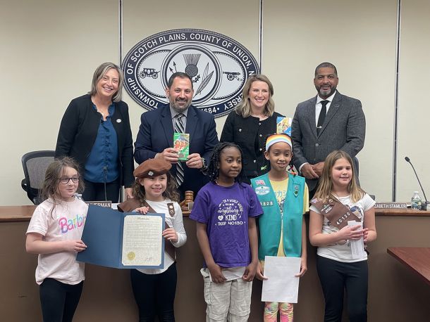 At the Council Meeting on Tuesday, March 5th Girl Scouts representing the Girl Scouts Heart of New Jersey gave a presentation highlighting achievements and service projects the scouts are involved in in Scotch Plains. The Council presented them with a proclamation recognizing March 12 as Girl Scout Day, celebrating the 112th anniversary of Girl Scouts of the USA, the largest and most successful leadership program for girls in the world! Girl Scouts Heart of New Jersey serves 11,000+ girls across New Jersey. Scotch Plains-Fanwood has 707 Girl Scouts and 301 adult volunteers. Cookies were enjoyed by all!