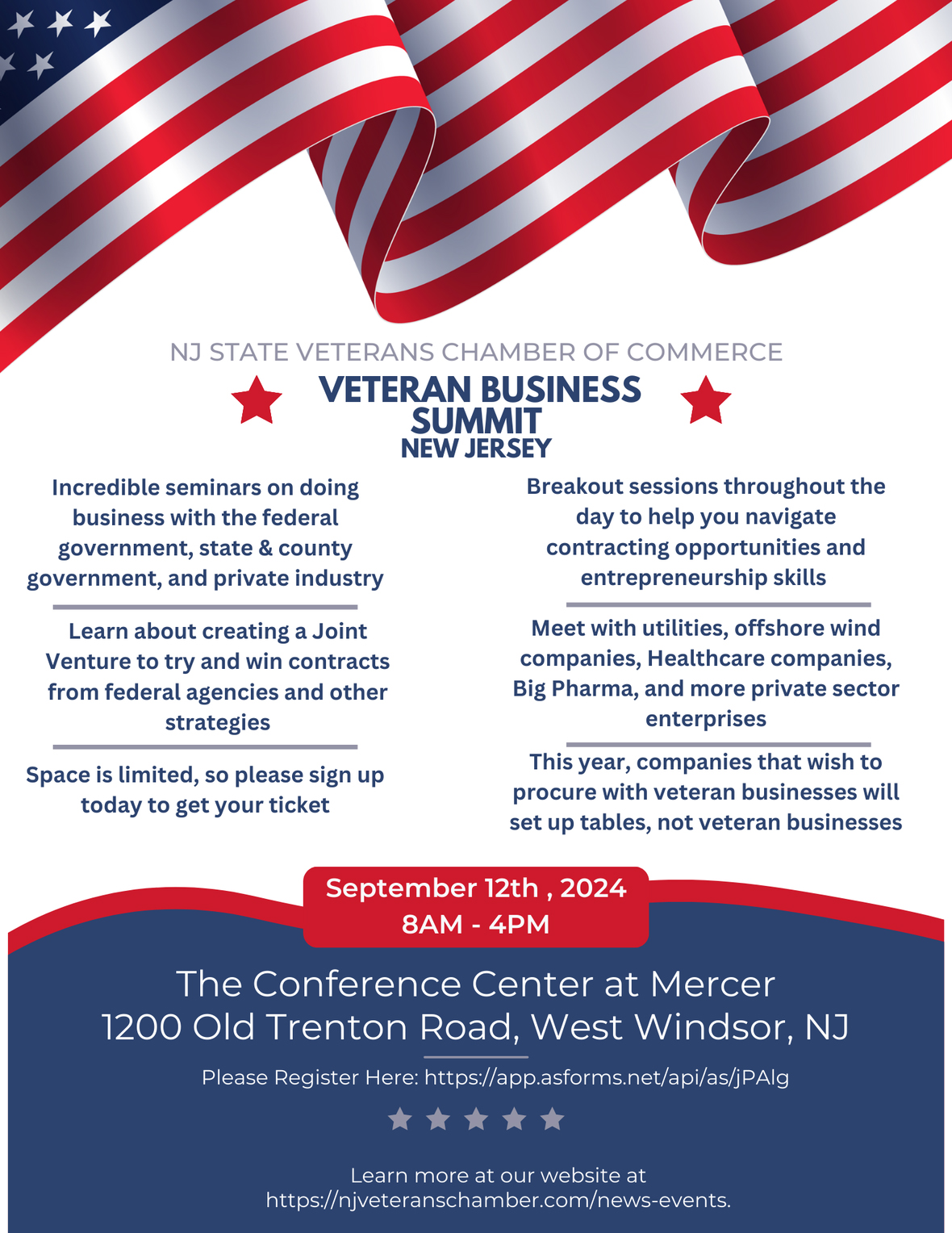 The NJ State Veterans Chamber of Commerce will conduct monthly webinars to best prepare you for the upcoming veteran business summit. These 1 hour, lunchtime webinars will discuss how to best prepare for these events, what you need to know, and hear about upcoming opportunities for procurement.