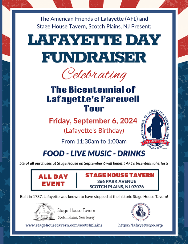 SCOTCH PLAINS – August 2, 2024 – The American Friends of Lafayette (AFL) and the Stage House Tavern in Scotch Plains are excited to announce that the National Bicentennial of Lafayette’s Farewell Tour will be celebrated in Scotch Plains at the Stage House Tavern on Friday, September 6 with a Lafayette Day Fundraiser on Lafayette’s birthday.