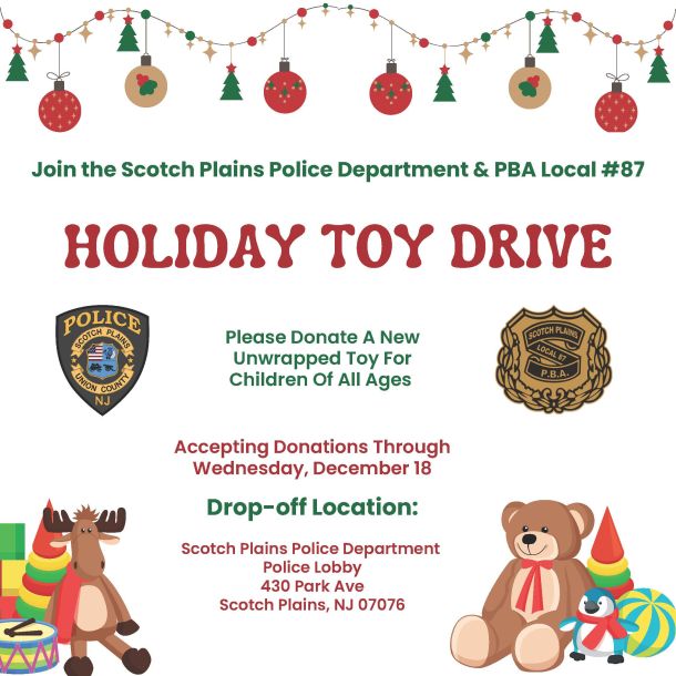 Join the Scotch Plains Police Department & PBA Local #87 for the Holiday Toy Drive, accepting donations through Wednesday, December 18. Please donate an unwrapped toy for children of all ages in the Scotch Plains Police Department Lobby at 430 Park Avenue.