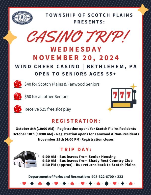 On Wednesday, November 20, Scotch Plains will host a trip to Wind Creek Casino in Bethlehem, PA, open to seniors 55 and older. Registration closes November 15.