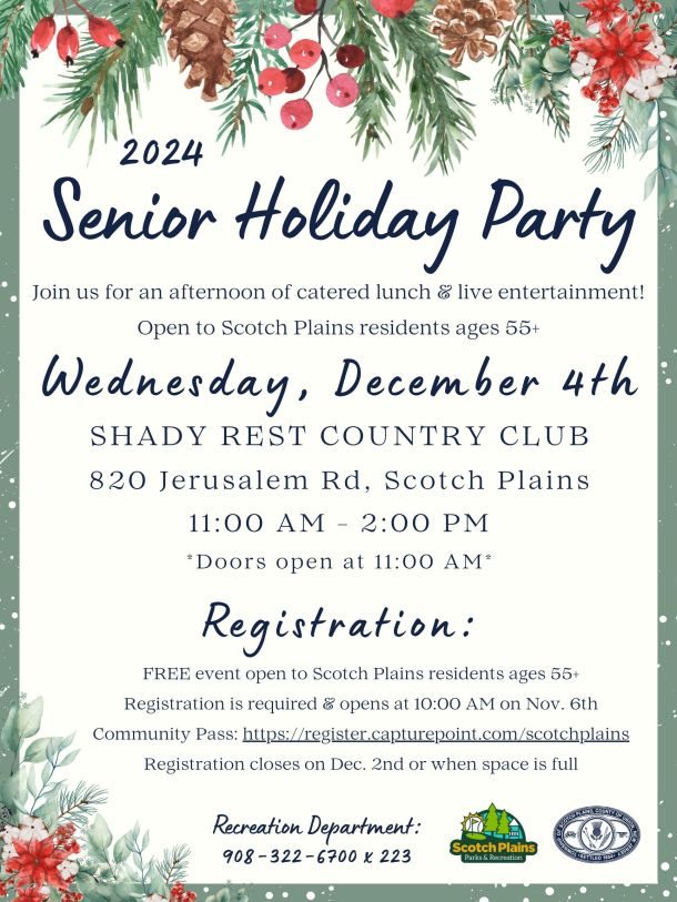 Join us for an afternoon of catered lunch and live entertainment open to Scotch Plains residents 55 and older on Wednesday, December 4 at Shady Rest Country Club, 820 Jerusalem Road. Doors open 11am.