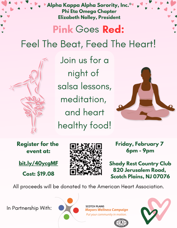 Join Alpha Kappa Alpha Sorority, Inc., Phi Eta Omega Chapter for "Pink Goes Red: Feel The Beat, Feed The Heart!" on Friday, February 7th from 6-9pm at Shady Rest Country Club in Scotch Plains, NJ. Enjoy an evening of salsa lessons, meditation, and heart-healthy food, all for a great cause! Tickets are $19.08, with proceeds benefiting the American Heart Association. Register today here and support heart health while having a fun and enriching experience!
