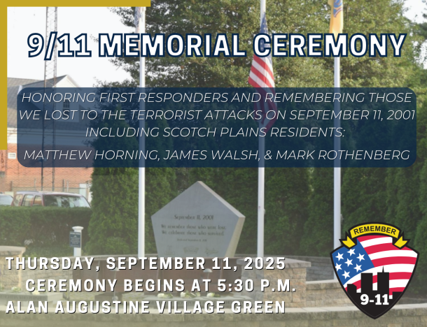 The Township of Scotch Plans is urging residents and guests to attend the annual remembrance of 9/11 at the annual ceremony, to be held Thursday, Sept. 11 at 5:30 p.m. at the Alan M. Augustine Village Green on Park Avenue.