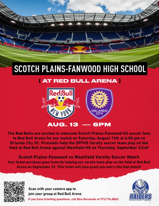 The Red Bulls are excited to welcome Scotch Plains-Fanwood HS soccer fans to Red Bull Arena for our match on Saturday, August 13th at 6:00 pm vs Orlando City SC.