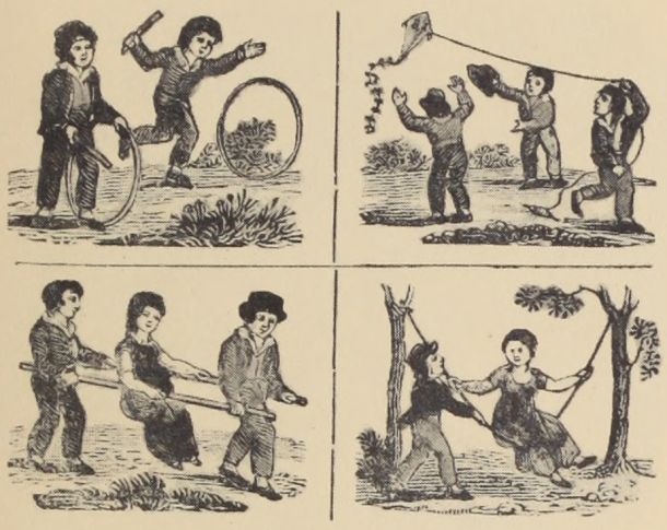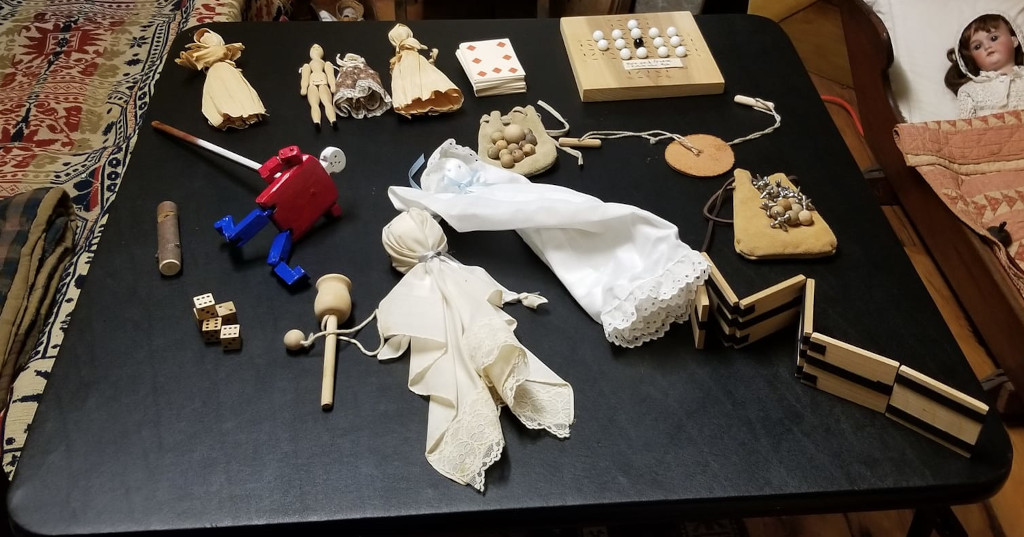 Children of long ago had fun despite their many chores. They always found time to play. Most of the toys were simple and a good imagination made playtime the most enjoyable time of each day. Boys played with spinning tops, jacks, or clay marbles. They made whistles out of blades of grass and made boats out of sticks and leaves. Girls played with corn husk, handkerchief, or wooden dolls. They made bracelets and necklaces out of dandelions and daisies. Both boys and girls had fun running while spinning a large wooden hoop with a stick. Some of the most popular toys were ball in a cup, Jacob’s ladder, spinners, quoits (ring toss), and draughts (checkers).