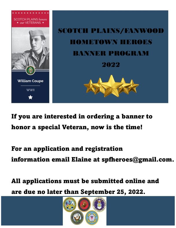 The Township of Scotch Plains, the Borough of Fanwood, American Legion Post 209 and Veterans of Foreign Wars Post 10122 are opening up the Banner Program once more, seeking to honor our local Veterans and those currently serving in the United States Armed Forces. The Banner Program Phase V will continue to recognize those Veterans (living and deceased) and Active Duty Military personnel who live or have lived in Scotch Plains or Fanwood. Banners for those who were a part of previous phases will continue to be put up each Memorial Day and Veterans Day. This will be the final chance to participate in the Banner Program. Also, please note that we cannot honor any requests to place a banner in a particular location.