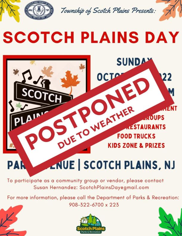 Due to the forecast of high winds and rain for tomorrow, Scotch Plains Day has been postponed! Please check back soon for a rescheduled date.