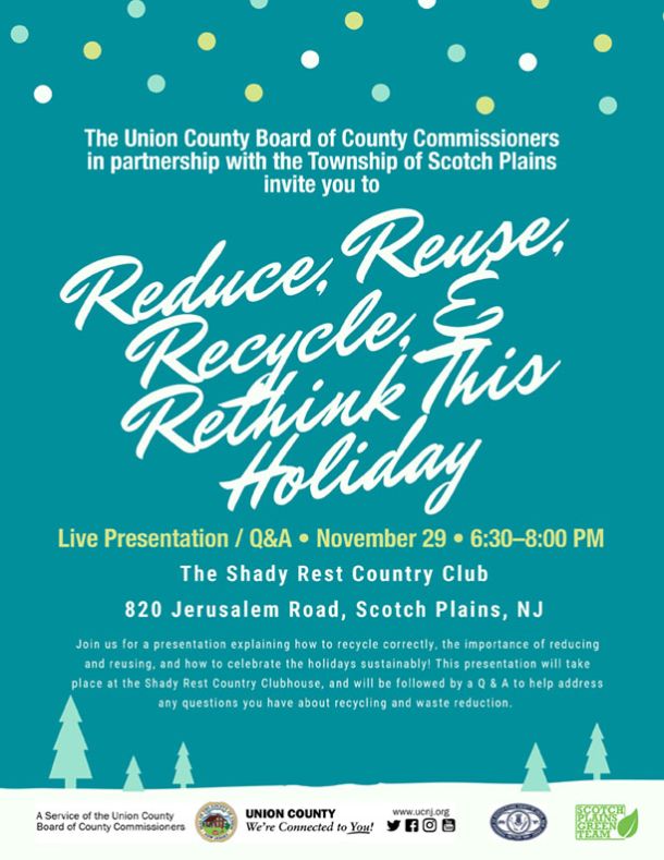 The Union County Board of County Commissioners in partnership with the Township of Scotch Plains invite you to Reduce, Reuse, Recycle, & Rethink This Holiday