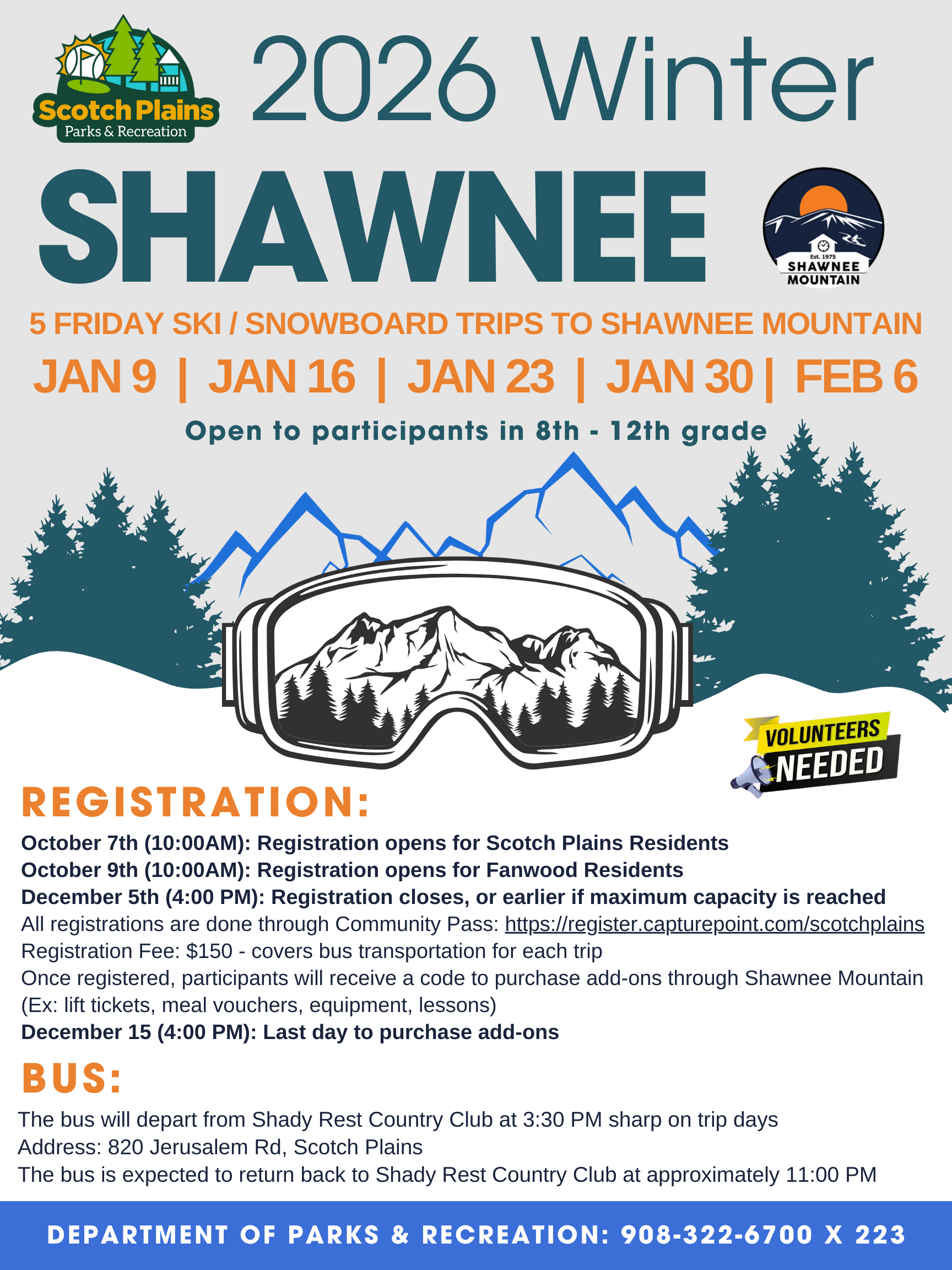 Once registered through Community Pass, a special Scotch Plains club link to Shawnee's website will be sent out. From there, you will need to purchase "Add-Ons." Examples of Add-Ons include: lift tickets, equipment rentals, lessons, and meal vouchers. Lift tickets are mandatory. Participants may bring their own equipment (HELMETS ARE REQUIRED) and their own food. Shawnee has a hard, set in stone, deadline for purchasing Add-Ons which will be communicated once the date is finalized.