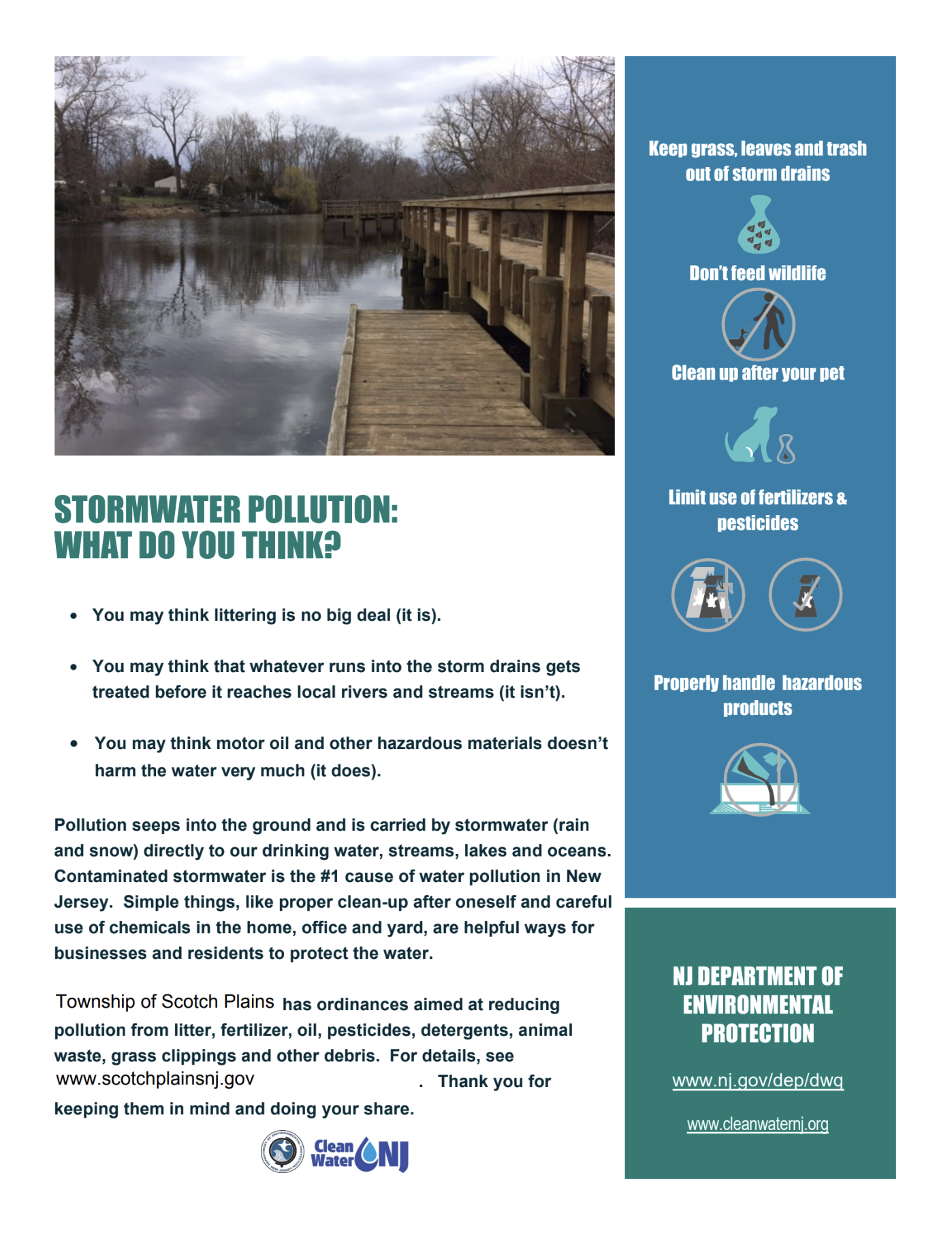 Stormwater runoff has been identified as the leading threat to the water quality in New Jersey. As development continues to increase, more contaminants find their way into our waterways, potentially impacting the quality of our drinking water. The NJDEP Municipal Stormwater Management Rules mandate municipalities to develop plans and implement certain pollution prevention measures to reduce the amount of pollutants entering our waterways.