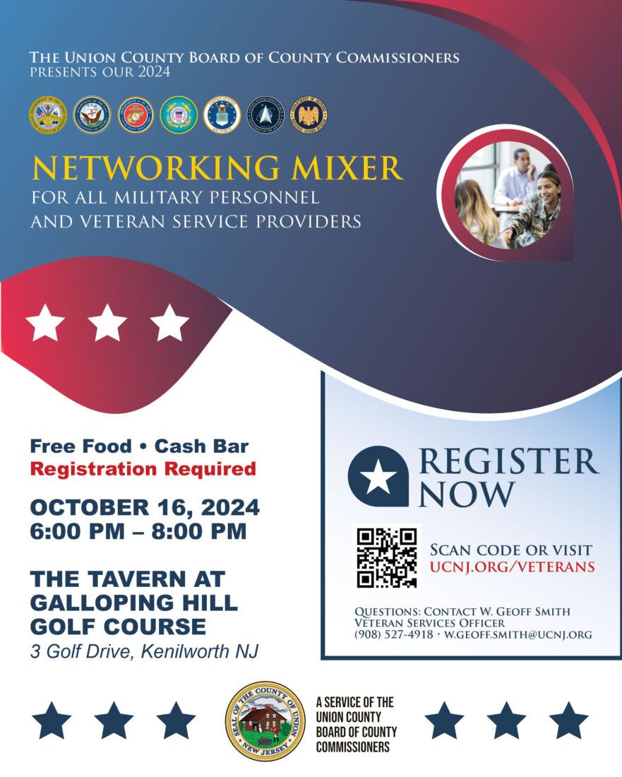 The Union County Board of County Commissioners cordially invites all military veterans, active duty personnel and veteran’s service providers to attend a free Networking Mixer on Wednesday, October 16th from 6:00 p.m. to 8:00 p.m. at The Tavern, located inside the Galloping Hill Golf Course, 3 Golf Drive in Kenilworth.